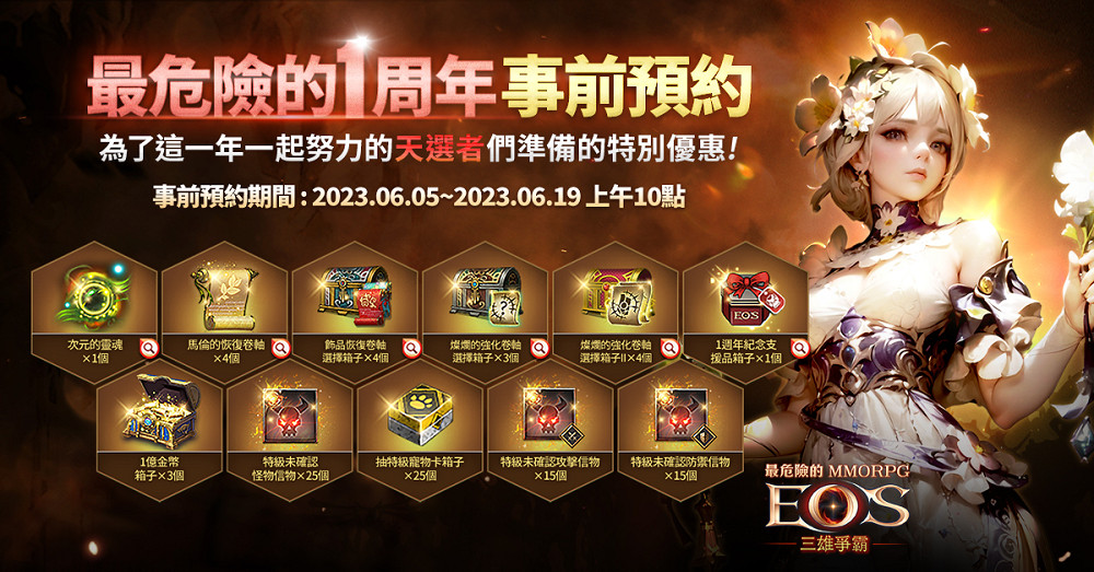 由韓國團隊BluePotion Games研發的最危險MMORPG手機遊戲《靈境殺戮:三雄爭霸》台港澳日韓戰場「ASIA」伺服器,在天選者的支持下,即將迎來開服1周年紀念,今(6/5)開啟1周年紀念事前預約活動,只要參加預約即可獲得眾多珍稀獎勵,並預告將舉辦一系列1周年紀念活動,答謝天選者的喜愛與陪伴!