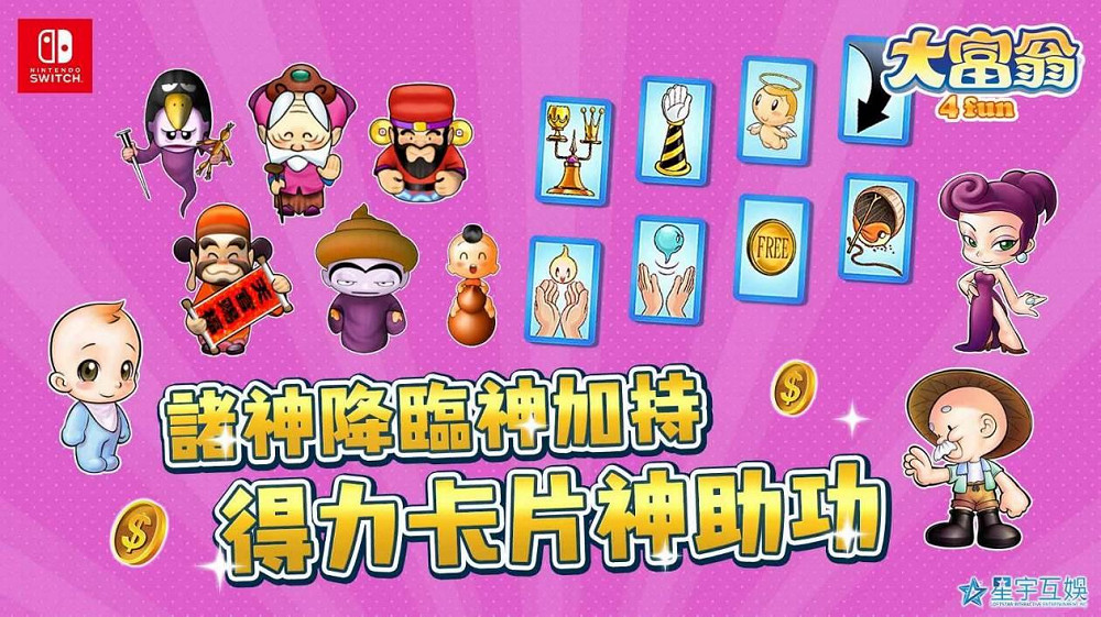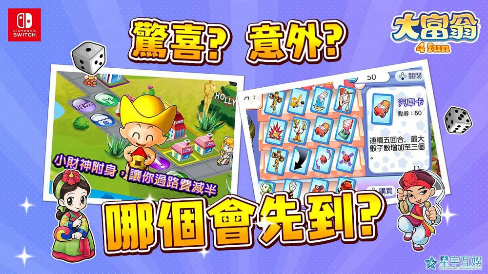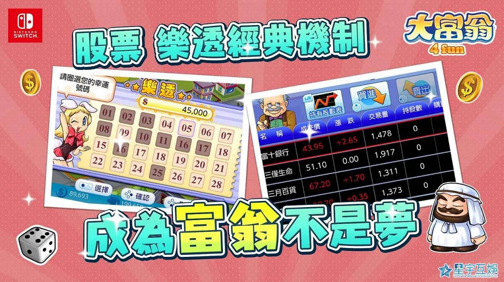自1989 年起推出《大富翁》一代至今已發行到第十一代,當年在台灣家庭電腦正要普及之際,《大富翁4》旋風式席捲全台玩家,從此爾後已在資深玩家心中佔據了一席重要位置。而以《大富翁4》為基礎進行移植的《大富翁4 Fun》,即將於7月6日正式登陸Switch。遊戲囊括了孫小美、金貝貝、阿土伯、錢夫人、沙隆巴斯等《大富翁4》中大獲好評的諸位經典角色,以及至少10張以上地圖可變換遊玩。同時,Switch版本支援最高6人同樂、非常適合暑假、連假期間三五好友相聚時連接電視,一起回味快樂童年的休閒益智遊戲!