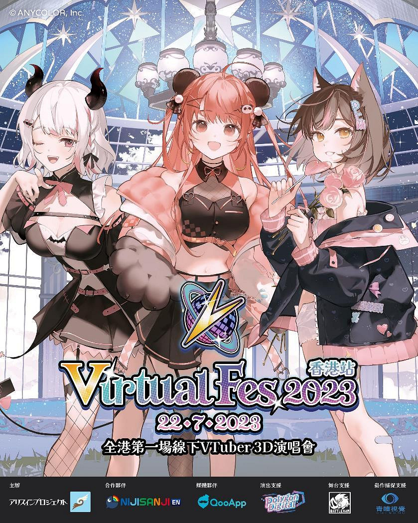 由「アリスインプロジェクト」與「飛天奶茶」 主辦,全港首個線下實地 VTuber 演唱會「Virtual Fes 2023 - 香港站」將於2023年7月22日舉行。是次活動除了有多位本地虛擬偶像參演外,更邀得全球知名人氣組合,來自「NIJISANJI EN」(彩虹社 EN)的 Luxiem 和 Noctyx 成員出演,為香港觀眾帶來夏日狂歡視聽體驗。門票將於6月15日,透過指定網站平台發售。