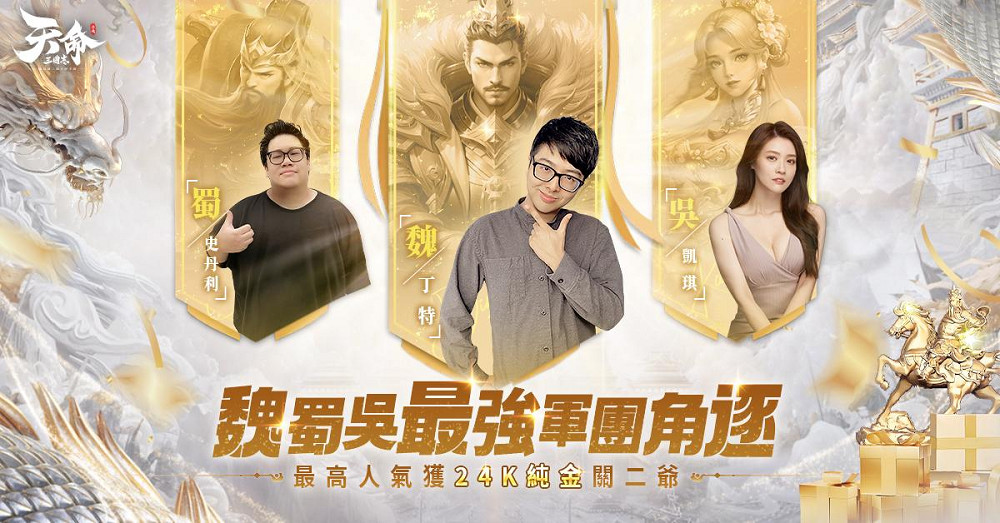 官方表示,事前活動還開放了「軍團集結」活動,丁特、史丹利、凱琪分別擔任魏蜀吳三國的軍團長,征集各位天命所歸,於關二爺像下與你們互道兄弟,共同為軍團打Call,一起贏下24K純金關二爺!