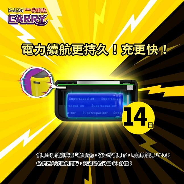 Pocket系列自動抓寶產品的設計宗旨,便是希望訓練家們在享受戶外活動時,也能夠同步推進《Pokémon Go》遊戲中的進度,Brook團隊日夜評測,只為讓訓練家們可以體驗到最穩定、最快速的使用體驗。不管是開車出遊、騎車或慢跑,實測在時速60 Km/h以下,皆可正常自動抓寶及補給道具,也不會干涉其他導航系統或慢跑APP的運作,讓訓練師能抓寶、出遊兩者兼顧。為了應對現代忙碌的生活,更在產品中使用環保儲能裝置「金電容」,只要完整充電90分鐘,即可在正常使用下連續使用14天! 在愛護地球的同時,更能體驗超長續航的自動抓寶體驗,抓寶體驗不間斷!