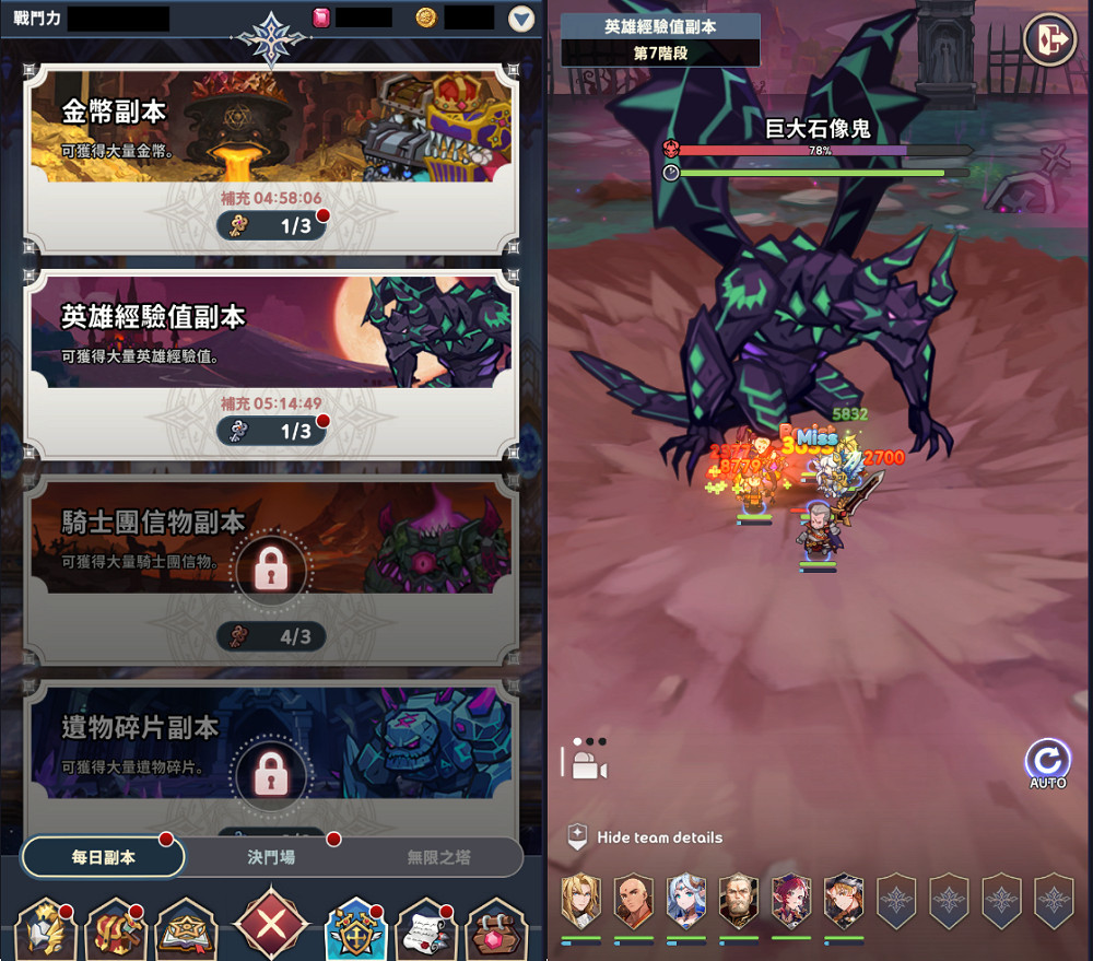 副本探索:與團隊一起探索特殊的副本挑戰以獲得遊戲內貨幣。這些挑戰包括「金幣副本」、「英雄經驗值副本」、「騎士團信物副本」以及「遺物碎片副本」。