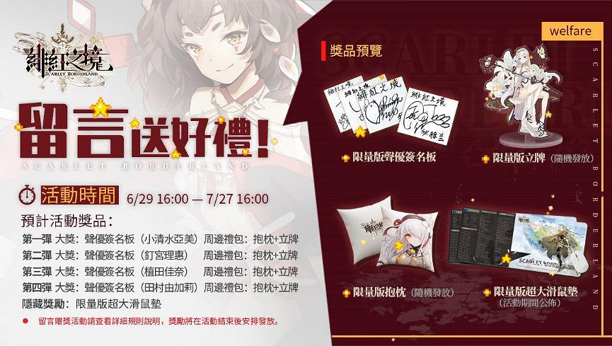 此外,現在參加留言抽獎活動,更有機會獲得日本知名聲優親筆簽名版等遊戲周邊獎品。官方也與名雪薇薇、帕豹Pabo、菈納等多名港台VTuber合作,只要加入收看VTuber們《緋紅之境》試玩直播活動,就有機會額外獲得虛寶兌換碼,粉絲們可千萬關注VTuber們的直播活動時間喔!
