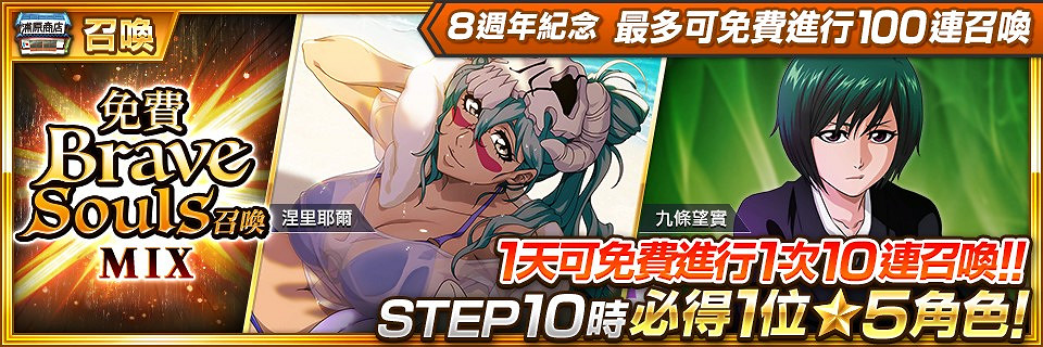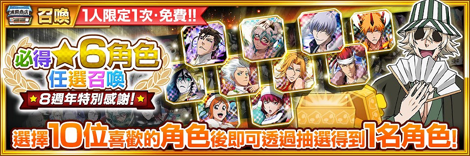 為慶祝8週年,1天可免費進行1次10連,最多可免費進行100連的召喚登場!