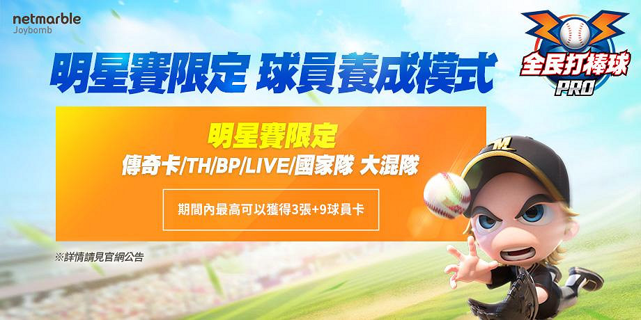 本次更新後,《全民打棒球Pro》開啟為期3週的明星賽主題「球員養成模式」。在今日至8月16日的3週裡,玩家可選擇喜愛、最高強化等級為+9至+10的球員組隊進行即時對戰,獲勝達指定次數後,最多可獲得3張強化等級+9球員卡。