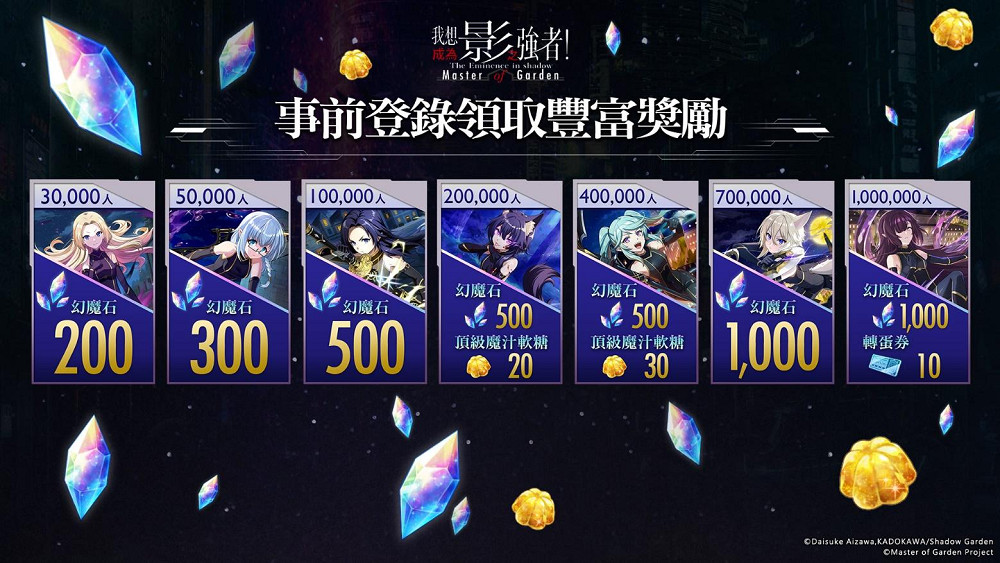 即日起前往《我想成為影之強者!Master of Garden》官方網站,完成事前登錄即可領取豐富獎勵!依據預約人數里程碑,只要達成相應數量的預約人數,即可在開服後領取幻魔石、頂級魔汁軟糖和轉蛋券等豪華獎品!趕緊邀請好友一同加入《我想成為影之強者!Master of Garden》預約行列吧!