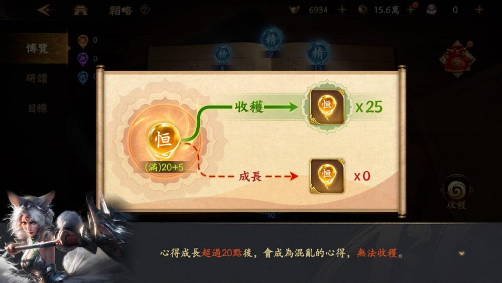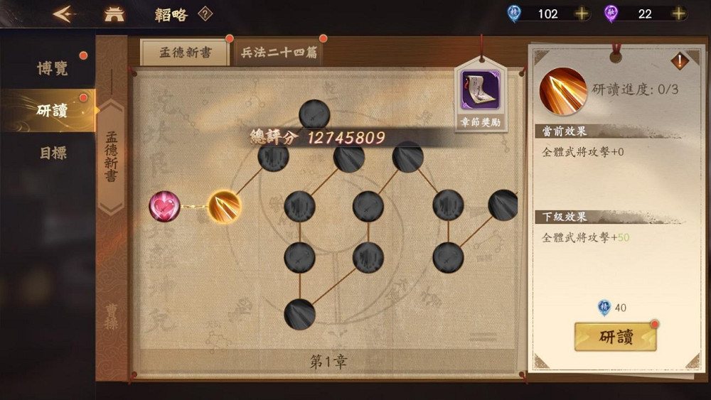 讓武將戰力提升的「韜略」開放囉!在沒有網路的三國時代,博覽萬卷書,可是提升自身能力的絕佳法門!在這個新系統裡,玩家每天可以博覽五次,並有機會領悟到不同的成長心得。利用研讀,將能增強己身陣容各式能力,不過俗話說,無論做甚麼事都得適可而止,過之猶不及,如果強行不斷成長目前博覽群書的心得,將可能讓寶貴的閱讀數值歸零,那可就得不償失啦!