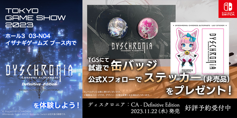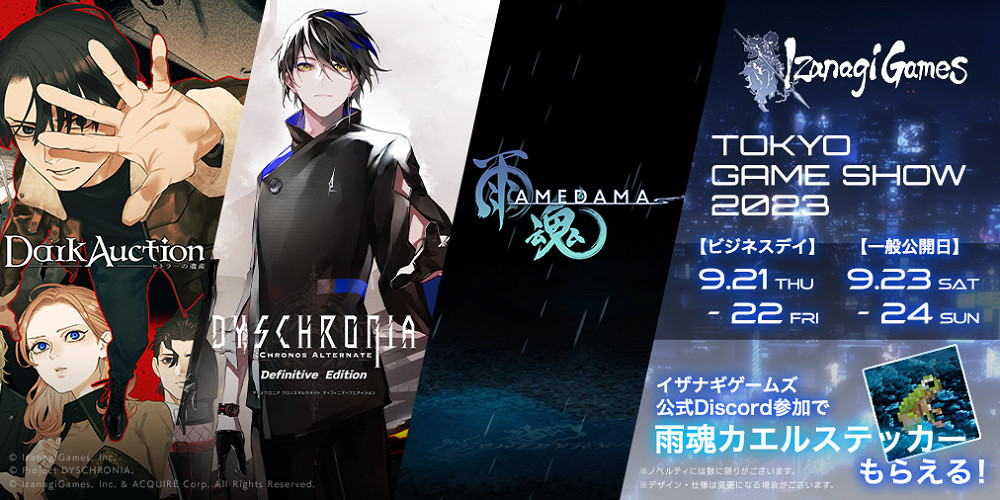 IzanagiGames, Inc.(位於東京都江東區,製作人兼 CEO:梅田慎介)宣布,將參加9月21日(四)~9/24(日)於日本千葉幕張展覽館舉辦的「2023 東京電玩展」,並公開展示內容。Nintendo Switch《虛時異境:迷離時空 終極版》及《雨魂 - AMEDAMA -》兩款預定今年發售的新作都可以在現場試玩。而目前募資中的新作《Dark Auction 希特勒的遺產(暫譯)》也將在現場展示最新遊戲預告以及角色等身大立牌。只要參加遊戲試玩、追蹤遊戲官方X帳號、加入IzanagiGames的官方Discord伺服器,就可以得到會場限定的特製周邊!歡迎您親臨「東京電玩展」現場!
