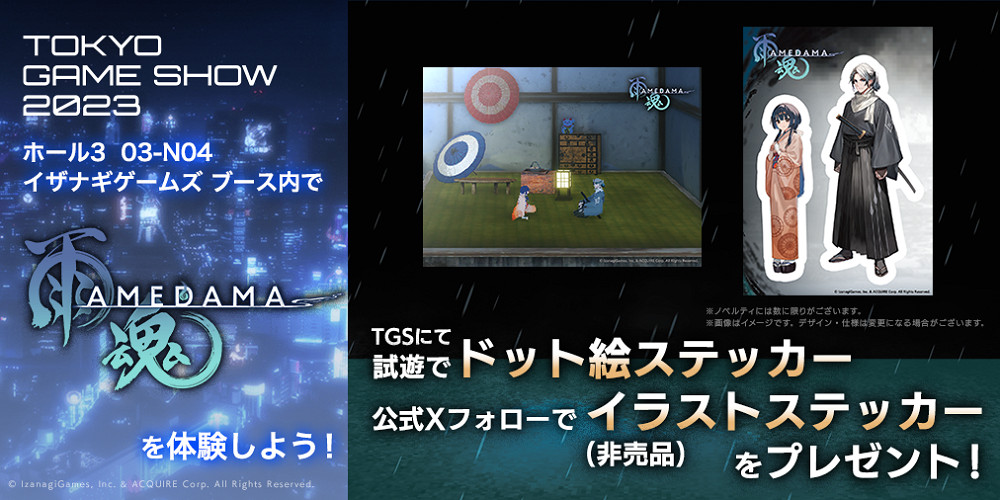 只要於東京電玩展會場試玩本作,或追蹤官方X帳號,即可獲得不同款式的《雨魂 - AMEDAMA -》特製貼紙!