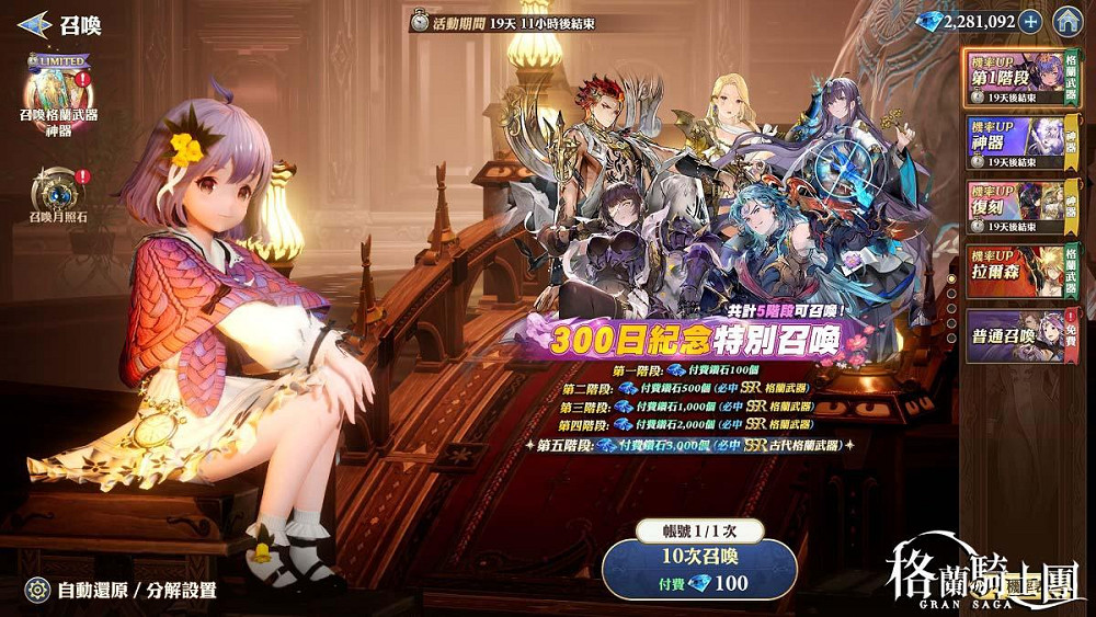 不知不覺遊戲也迎來了300日!為了感謝玩家們的支持,全新慶典Step召喚卡池將限時推出,古代格蘭武器獲得機率超大提升!超划算的限定卡池讓你用少少的鑽石就能獲得大大的報酬,最低只需要600鑽石就能獲得一張SSR格蘭武器!絕對不要錯過千載難逢的機會。