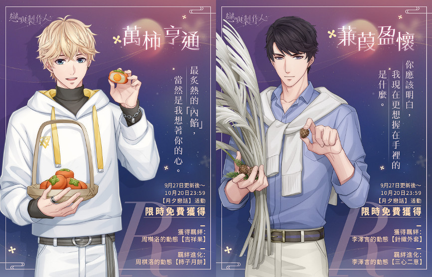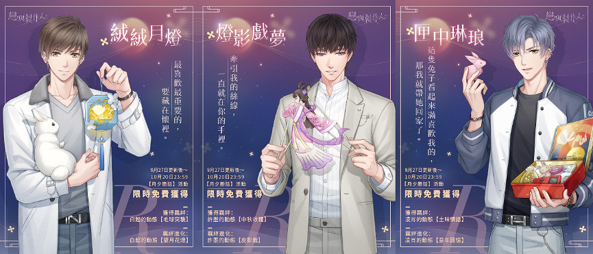 中秋月圓人團圓,在這個相聚的節日,和心愛的「他」共度佳節!9月29日至10月1日止,《戀與製作人》推出眾多中秋節日福利,活動期間內,玩家登入遊戲即可收到「他」的中秋登入問候、訊息與鑽石好禮,共可獲得「鑽石*500」。