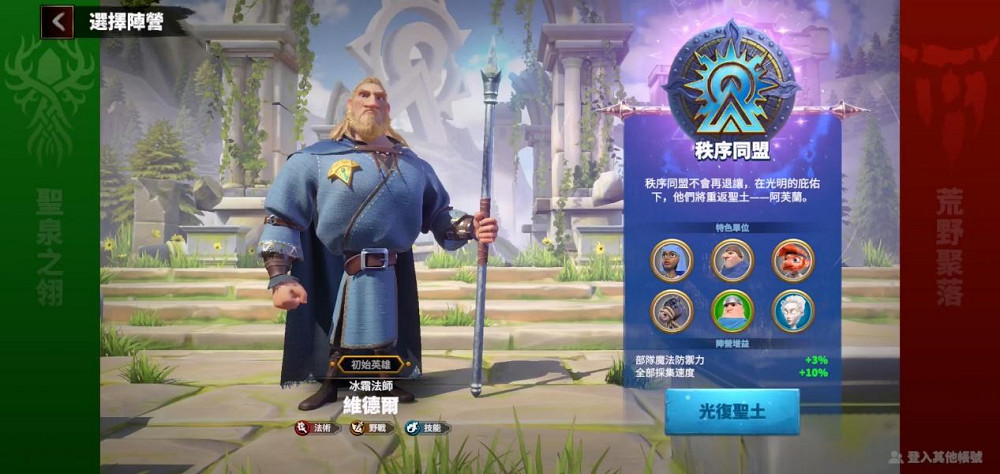 在秩序同盟中,領主將邂逅的第一名英雄是王庭法師冰魔法師「維德爾」,他將用他擅長的冰息法術,冰凍敵人為領主開疆拓土。