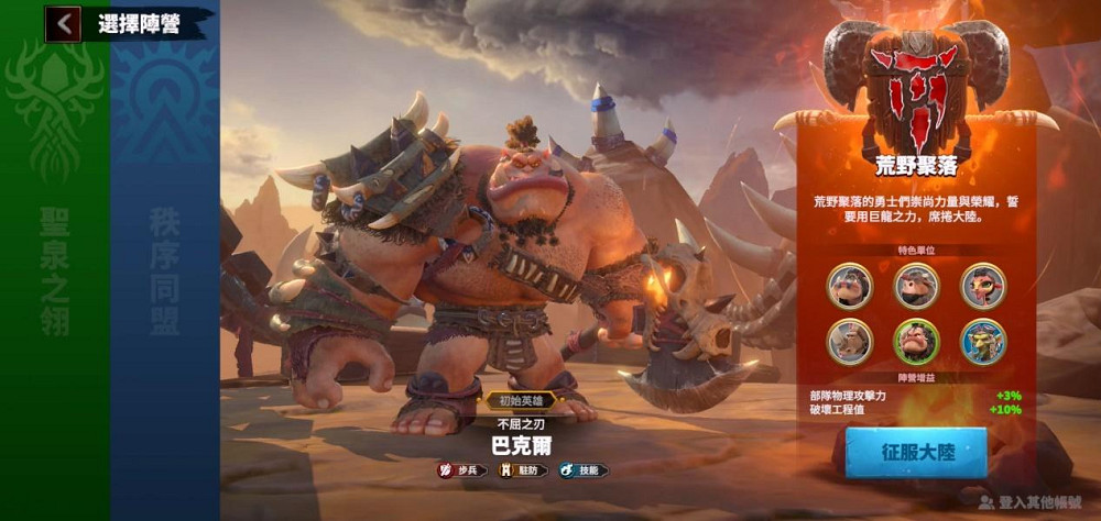 荒野聚落由好戰的獸人組成,他們曾多次征服大陸,力圖統一整個大陸。城鎮的整體特色充滿野性風格和力量,並有著濃厚的聚落氛圍。聚落部隊勇士擁有物理攻擊和破壞工程的加成,有利於在攻城掠地上取得優勢。特色兵種: