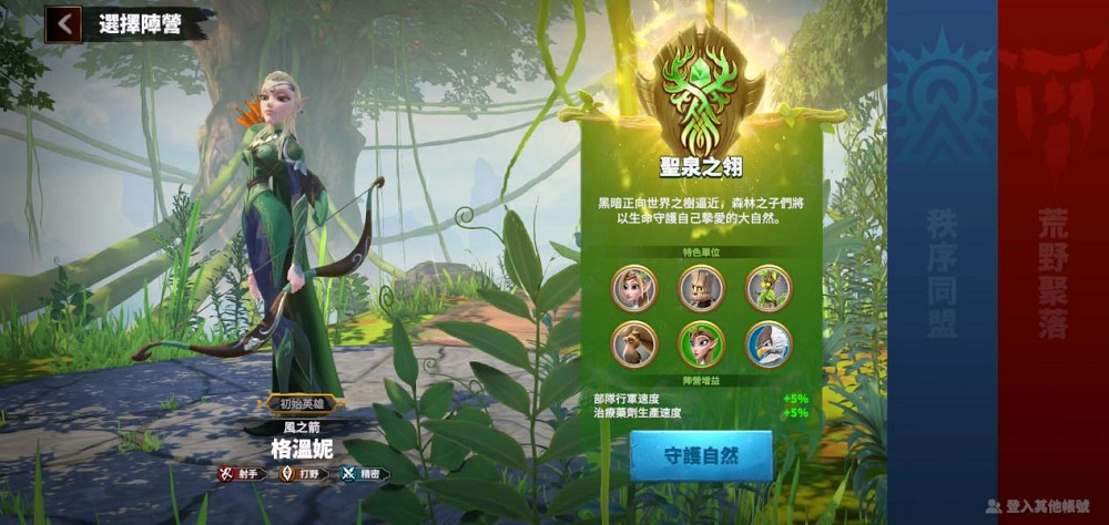 聖泉之翎的居民受到森林之神「愛維瑞爾」的庇佑,他們世代守護自然的和諧與安寧,並為了森林的存續而戰,擁有最快的行軍速度和治療劑的生產速度。特色兵種: