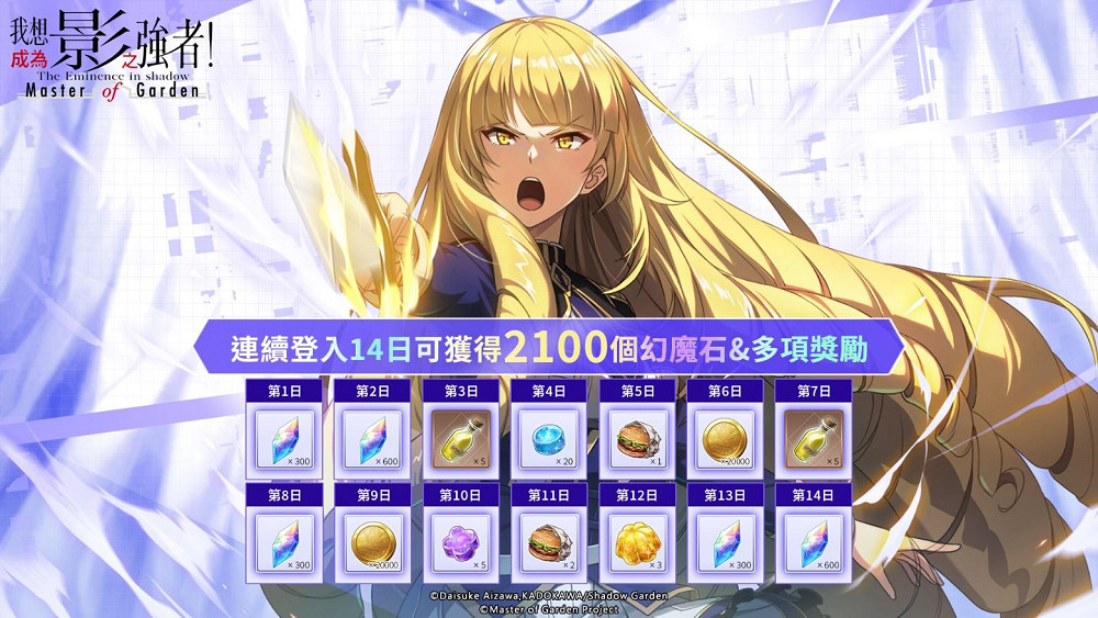 官方為慶祝《我想成為影之強者!Master of Garden》正式上市,將舉辦一系列的開服慶祝特典。剛轉生異世界的闇影大人們,登入即可領取多項登入獎勵!讓異世界之旅更加輕鬆寫意,從10月5日開服後14天內,每日登入遊戲即可領取登入禮,全部領取完畢能夠領取到幻魔石x2100及各式素材!