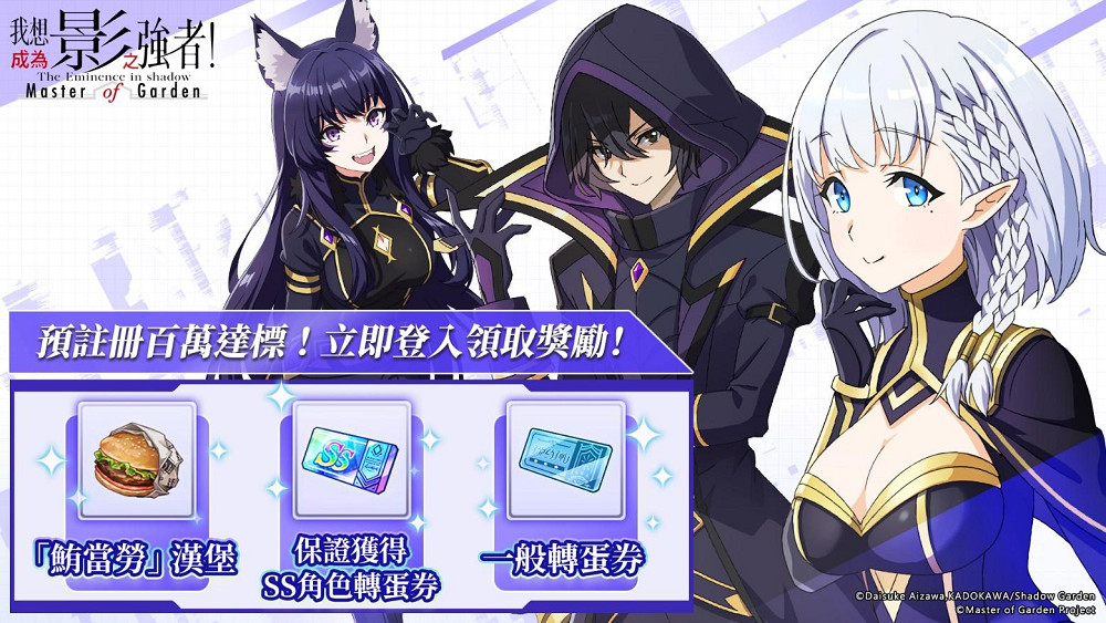《我想成為影之強者!Master of Garden》預註冊人數突破百萬大關,除了雙平台預註冊獎勵,總共解鎖了「幻魔石x4000」、「一般轉蛋券x10」、「頂級魔汁軟糖x50」。此外先前於官方Facebook粉絲專頁舉辦的「Icon徵選活動」,也將於開服贈送「鮪當勞漢堡x100」、「幻魔石x300」、「一般轉蛋券x10」。感謝各位闇影大人們熱情參與,獎勵將於開服後透過遊戲內郵件發送。各位闇影大人們,別讓了登入遊戲中領取滿滿獎勵喔!