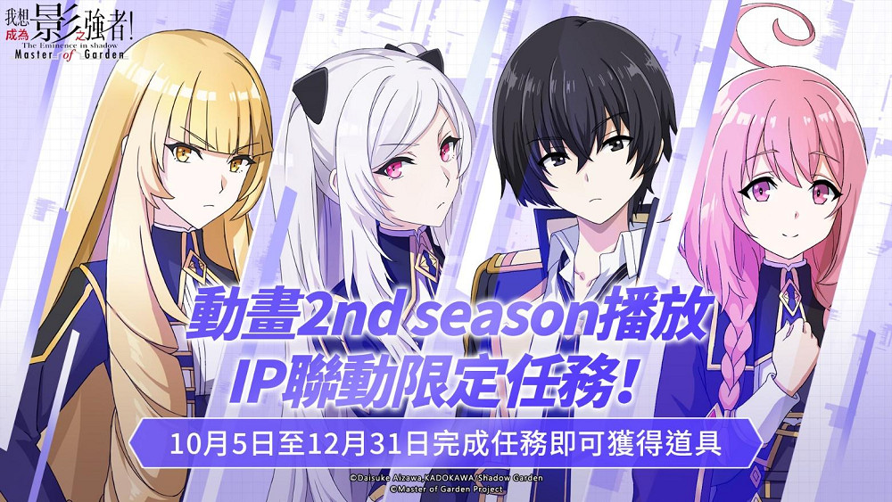 為慶祝《我想成為影之強者!Master of Garden》將與同名動畫第二季同時於10月5日上線,官方準備多項獎品以及虛寶給各位闇影大人們!即日起至12月31日止,共有三輪活動,於指定期間內完成活動任務即可獲取道具獎勵!另外在10/5至10/9日期間登入,還能領取額外的10連抽!邀請粉絲們一同共襄盛舉!