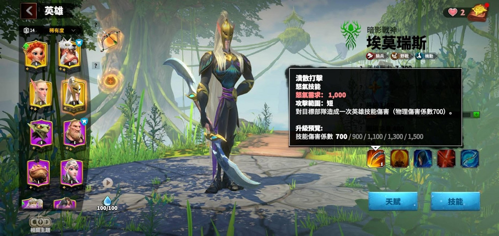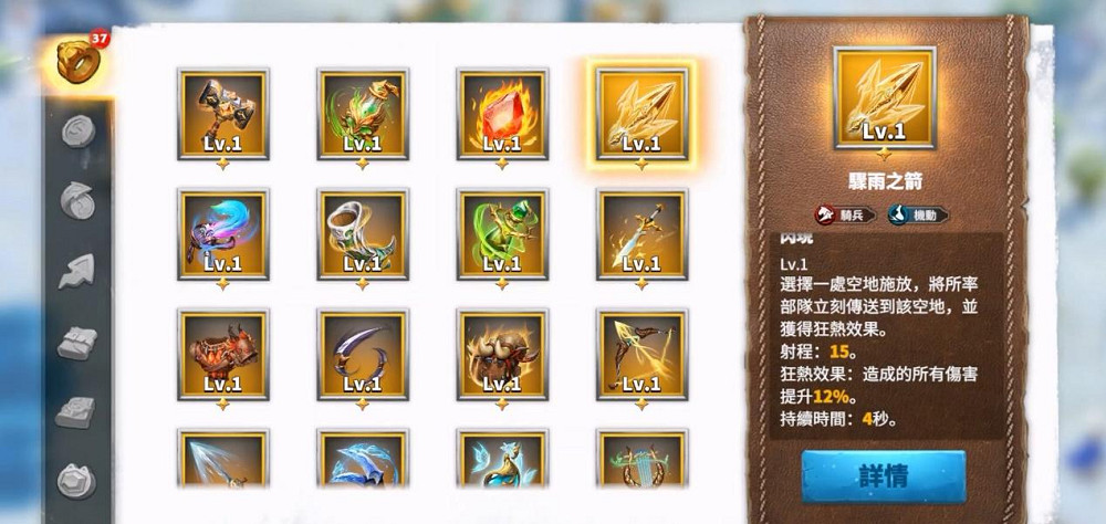 每位英雄都擁有獨特的技能,這些技能將在戰場上增加策略的多樣性。不僅有強大的主動技能,還有針對步兵、騎兵等不同單位的被動技能,如何在英雄成長的過程中,選擇合適的技能進行升級,是培養英雄的關鍵。領主可以根據每位英雄的特點進行培育,選擇合適的定位,包括擅長率領的兵種、適合PvP或PvE、能提升部隊機動力或進行輔助等等。
