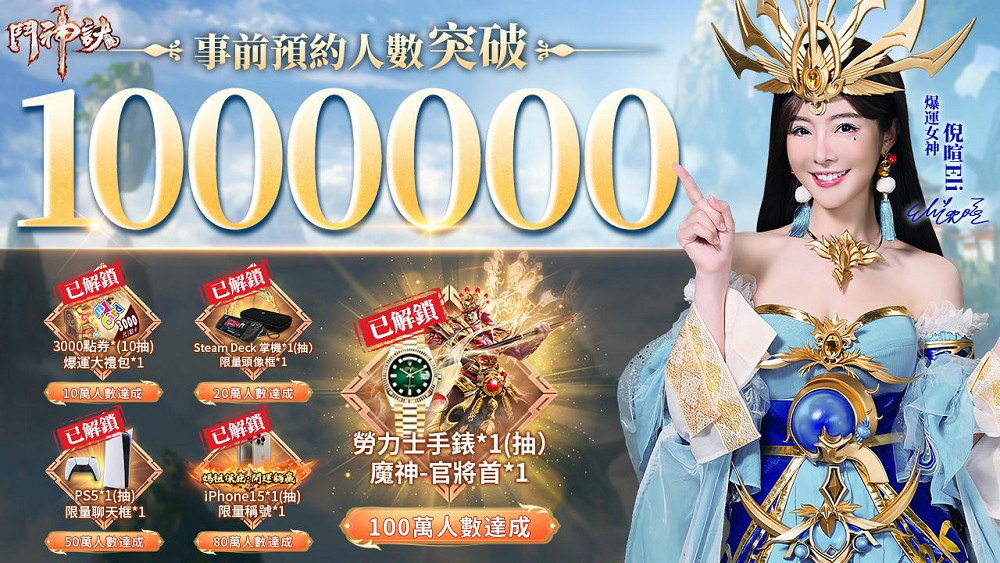 神明保庇高爆放置RPG手遊《鬥神訣》(iOS / Android)今(1)日宣佈事前預約人數已突破百萬人次,解鎖更多實物抽獎及遊戲虛寶獎勵,領取預約豪禮僅剩最後幾小時! 官方也公佈遊戲將於 11月 1 日(三)下午18:00開放搶先下載, 11月 2日伺服器正式上線。