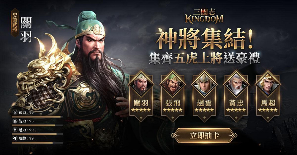 百將爭鳴,誰才是你的最強神將?《三國志Kingdom》遊戲官方正式開啟神將集結活動,只要參與事前預約,所有玩家即可獲得戰神「呂布」與神將40連抽,每日登入參與神將集結活動,還能獲得五星神將——武聖「關羽」!在眾神將的幫助下,主公定能輕鬆征戰三國王朝,如入無人之境!集齊蜀國五虎將完成隱藏任務,解鎖抽取三星Galaxy S23 Ultra的機會,全方位助力玩家們展開征戰!