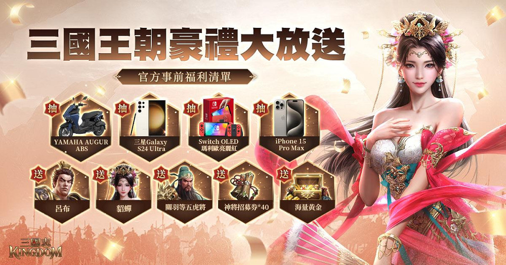 《三國志Kingdom》官方還準備了超豐厚的事前獎勵,玩家們邀請好友完成事前登錄,一起解鎖達成豪禮,AirPods Pro 2、iPad Pro、三星Galaxy S23 Ultra、YAMAHA機車等大獎等你帶回家!快來與我們一起開啟三國王朝新征途,征服亂世梟雄平定中原,更多《三國志Kingdom》相關資訊與福利,敬請關注官方粉絲專頁和後續新聞資訊。