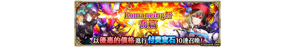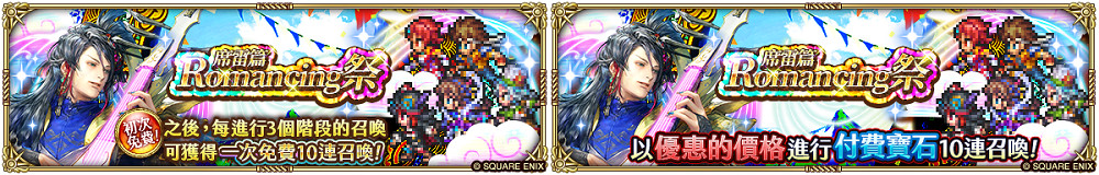 「Romancing祭 席雷篇」將分為不限輪數的免費寶石階段召喚及 3 輪限定的付費寶石階段召喚。在免費寶石階段召喚中,於階段 1 時將可以進行一次「免費」的 10 連召喚,而在付費寶石階段召喚中,則可以使用更優惠的寶石數量進行 10 連召喚!