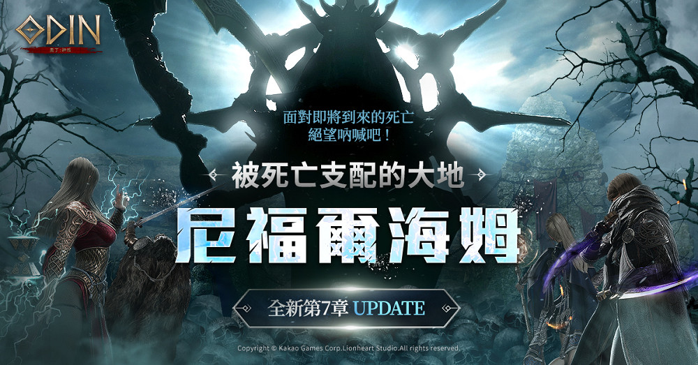 「尼福爾海姆」;《奧丁:神叛》世界中的第七片大陸,一個被死亡所支配的死後世界。這裡不僅被黑暗與濃厚的霧氣所籠罩,由蛇骨構成的地形更是該地圖的獨有特色。 此外與以往相比都還要強大的Boss、全新組隊副本與各項豐富內容也都將在這片新大陸上等著戰士們前往挑戰。