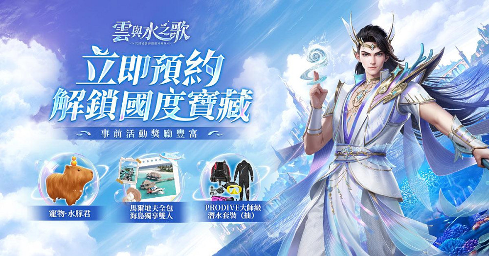 立即預約即可獲得《雲與水之歌》官方準備的超可愛寵物「水豚君卡皮巴拉」,和限定水之國外顯「鮫人皮膚」,和好友一起預約,還能解鎖超人氣達成豪禮,馬爾地夫全包海島獨享雙人十天、PRODIVE大師級潛水套裝等大獎等你帶回家!快來與我們一起環遊雲海,尋覓美好,更多《雲與水之歌》相關資訊與福利,敬請關注官方粉絲專頁和後續新聞資訊。