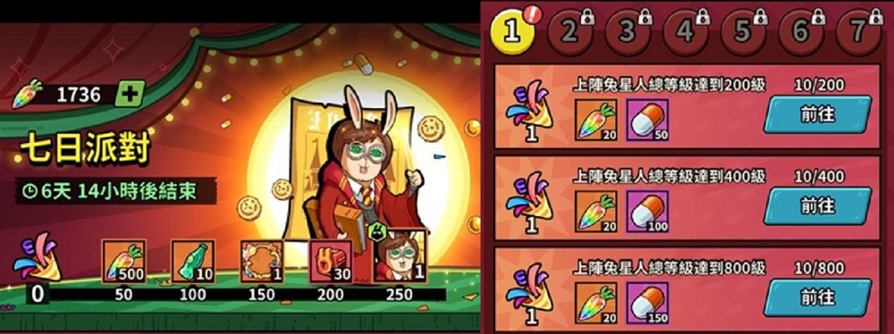 《兔星保衛戰》正式上線,玩家們除了可以獲得事前登錄的預約好禮之外,還有一個人人有獎的七日派對活動正等著你唷!在這個活動裡,玩家只要每天上線進行正常遊玩,就能獲得大量的遊戲重要道具,甚至有機會在最終取得SS級兔星人「發明家」的特製造型:巫師發明家!是的,在《兔星保衛戰》取得高等造型,就是這麼輕鬆簡單,千萬別懷疑你的眼睛!