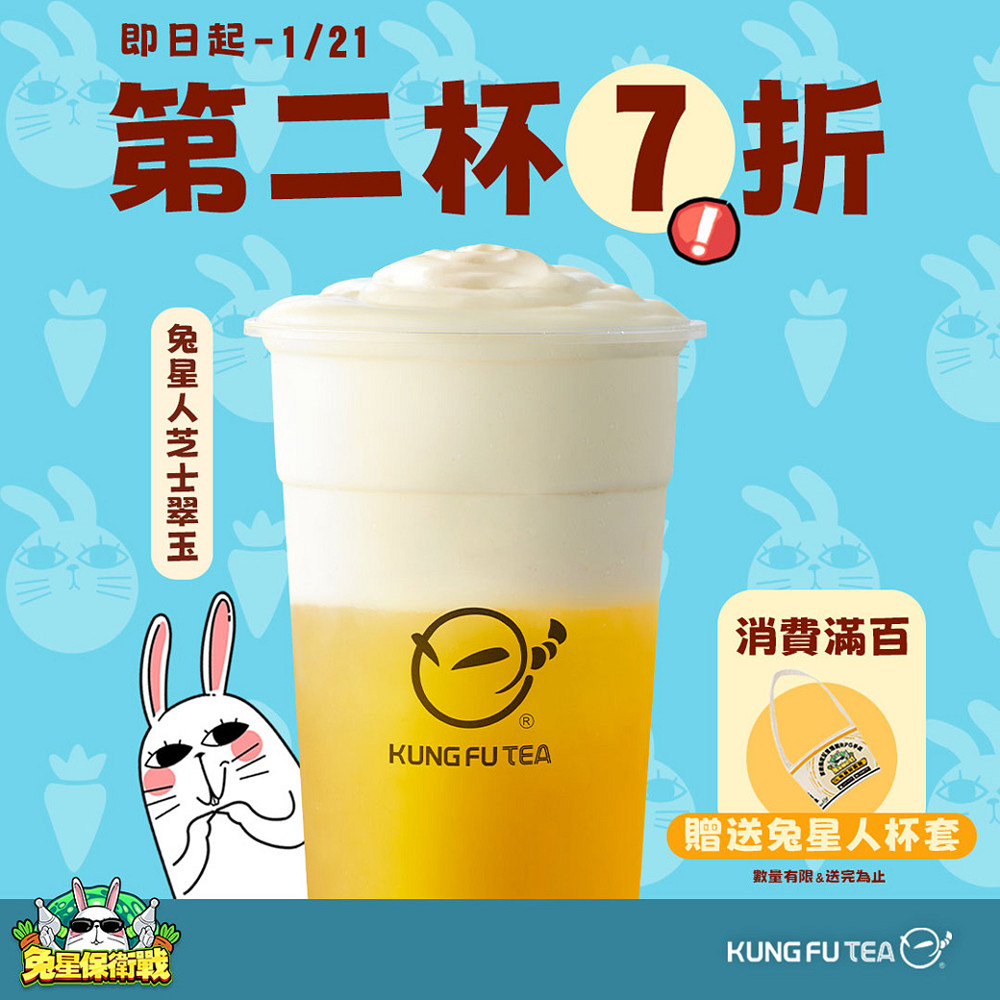 《兔星保衛戰》與深耕十餘年,做好茶才是真功夫的『功夫茶KUNG FU TEA』聯名活動再添一波!即日起至功夫茶各大門市消費飲品滿百元,立即贈送《兔星保衛戰》特製環保杯套一組,不用抽獎不用碰運氣,高達5萬個杯套人人有獎,但是要注意這可是限量贈品,送完就沒有囉!另外千萬別忘記,還有指定飲品消費即贈遊戲虛寶酷卡的活動唷!