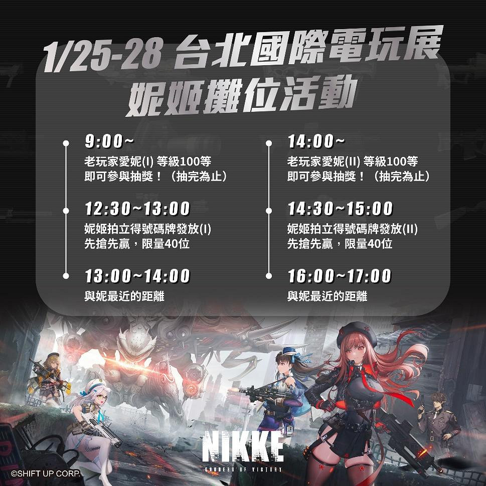 2024年台北國際電玩展(1/25至1/28)期間,《勝利女神:妮姬》官方準備了每日打卡禮,以及受到指揮官們熱烈期待的妮姬豐富週邊,邀請指揮官們前來南港展覽館一館集結!