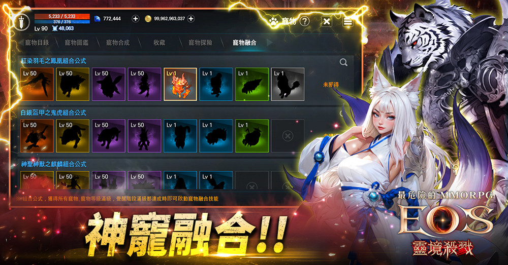 先前官方釋出「寵物融合系統」的訊息時就已經受到不少玩家的關注,在本次改版後玩家只要收集所有指定種類的寵物並且滿等後,即可獲得寵物融合技能,使用技能可讓玩家角色在一定時間內改變形象外觀,並且獲得各種強化能力,本次有四種神寵造型外觀分別是九尾狐﹅鳳凰﹅麒麟 ﹅鬼虎。玩家可因應職業不同選擇融合最適配的寵物,來提高刷怪的效率以及PK的生存率。