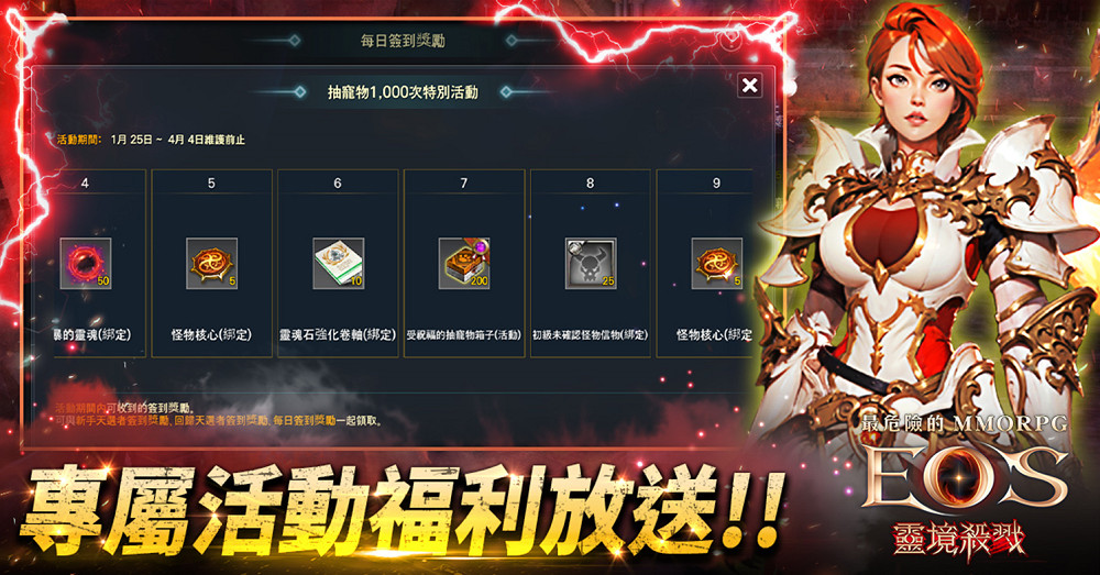 除了新伺服器「路克」的專屬活動以外,官方也推出全服(包含路克)特別活動,首先就是在事前預約就已經發布的「抽寵物1000次特別活動」,玩家只要在2024/1/25-4/4(伺服器維護前)期間完成簽到即可獲得抽寵物1000次以及大量獎勵,獎勵內容有受祝福的抽寵物箱子﹅Premium抽寵物箱子等多種非常實用的道具,讓玩家在野外刷怪多了一層保障。