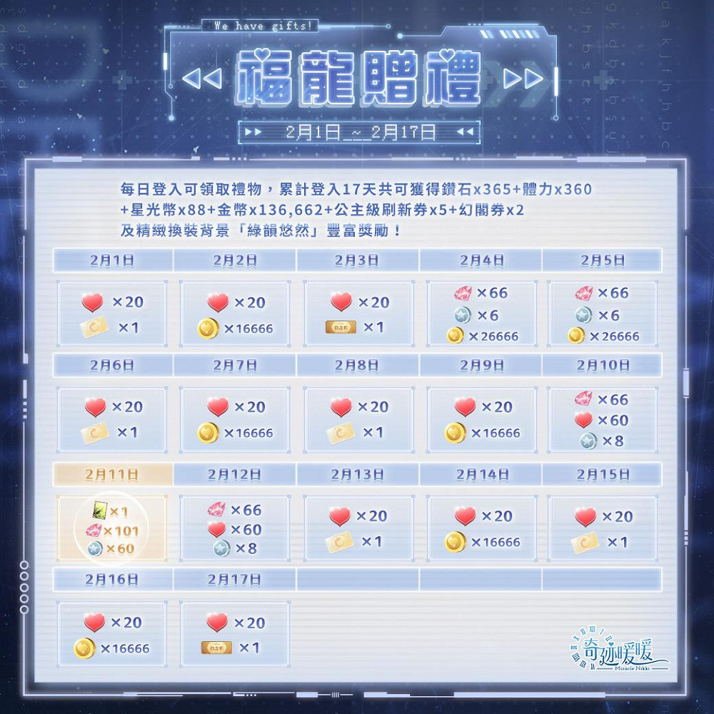 2月1日起至17日止,搭配師每日前往「福龍贈禮」活動介面,即可領取當日贈禮,累計登入17天共可獲得背景「綠韻悠然」、「鑽石*365」、「體力*360」、「星光幣*88」、「金幣*136,662」、「公主級刷新券*5」以及「幻閣券*2」的豐富獎勵!