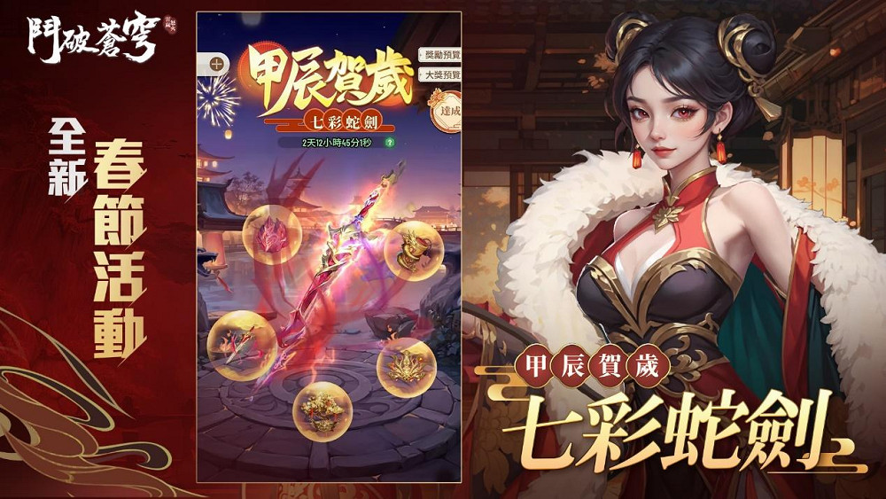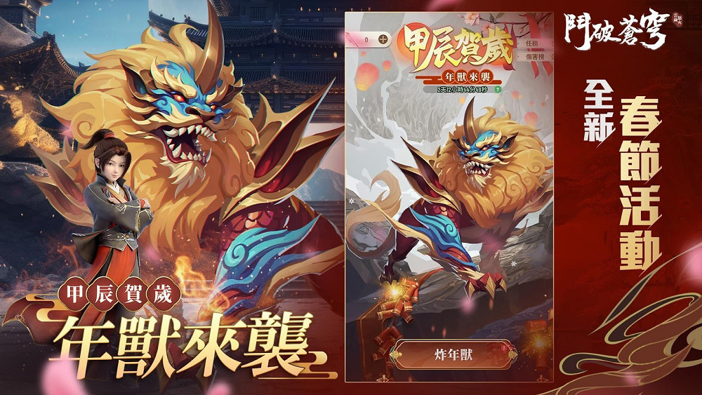 玩家在春節活動中,除了可以體驗到春節、情人節以及元宵節的限定版故事線之外,還有機會獲得全新異火「紅蓮業火」以及全新鬥器「七彩蛇劍」,更可以挑戰BOSS年獸領取豐富虛寶。此外,蕭炎、美杜莎也迎來了首次「角色改版」,只要於活動期間登入遊戲即可領取春節限定外型,官方更準備了橙色異寶「甲辰爆仗」、「鴛鴦連環」、「元宵節薰兒頭像」等多樣好禮,要來免費送給玩家們!