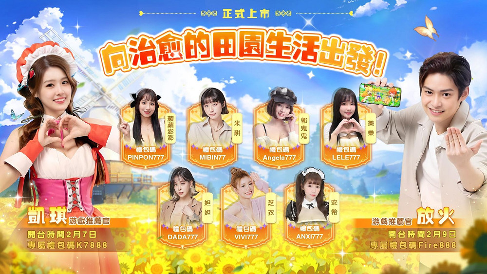 為了幫助各位領主大人能快速享受到治癒的田園生活,官方特別請到了「放火」「凱琪」「蘋蘋澎澎」「妲妲」「安希」「樂樂」「芝衣」「米餅」「郭鬼鬼」等實況主來參加遊戲上市活動,為大家準備了獎勵豐厚的紅人專屬禮包碼,帶著大家一起快樂種田!