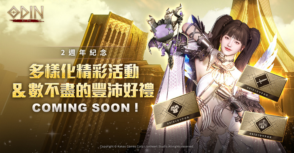 除了在活動網頁釋出的預告內容之外,在2週年改版當天(3/28),遊戲內也將準備多樣好玩又有趣的活動要來與戰士們一起慶祝2歲生日!如;「2週年慶典!21天簽到」、「2週年慶典!兌換活動」、「2週年紀念!萊恩輪盤交換活動」與「2週年慶典!大陸侵略者及奧丁石像」等。此外透過參與活動,即可獲得「奧丁的武器形象序號」、「奧丁武器復原序號」、「奧丁防具復原序號」、各樣「神聖召喚11次券」以及其他數不盡的超狂豐沛好禮。屆時再請玩家與我們一同歡慶奧丁2週年,各種獎勵等待您前來領取!