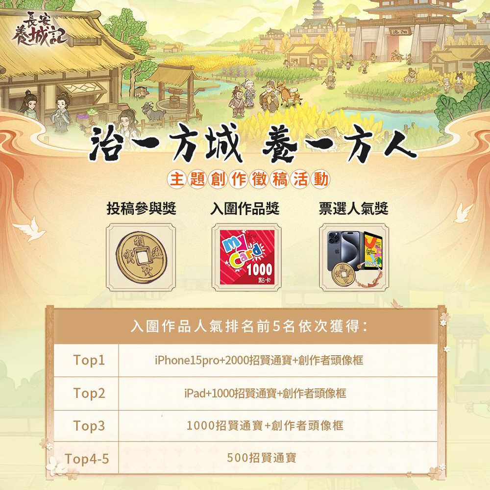 另外,為了讓身懷絕技的城主們大展長才,官方也特別策劃「二創徵稿賽事」,不限題材與風格,徵求滿腹才華的城主,圍繞《長安養城記》發揮創意,城主可依照擅長的領域報名,在《長安養城記》臉書討論組、巴哈姆特、YouTube上發布二創作品,標題帶上「#長安養城記」或「#長安城角色二創投稿」等活動標籤,只要投稿審核通過即可獲得參加獎,優秀的二創作品還將獲得iPad、iPhone等豐厚獎品。