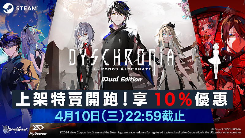 IzanagiGames, Inc.(位於東京都江東區,製作人兼 CEO:梅田慎介)宣布,與MyDearest Inc.(位於東京都中央區,CEO:岸上健人)共同開發的Steam《虛時異境:迷離時空 雙重版》今天(3月28日)正式發售。並於於即日起至4月10日止,舉行折扣10%的上架特賣。優惠期間享特惠價538元。