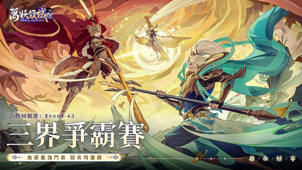《萬妖領域》三界爭霸賽火熱進行中,只要加入專屬伺服器<Event-43>就可以參加,除了有機會獲得豪華虛寶外,冠軍門派將可以為伺服器取名,更可以登上鬧區戶外看板,助力諸位名振三界;目前活動已經進行兩周,冠軍門派由日本代表暫時領先,韓國及港台則暫居後位,邀請各位守護使們可以一起加入位港台門派助力!官方粉絲團為慶祝全新UR神將「哪吒」的推出,也舉辦留言按讚送虛寶活動,只要達成指定內容,就有機會將鍾馗送福帶回家;更多遊戲相關資訊請關注《萬妖領域》關分粉絲團。