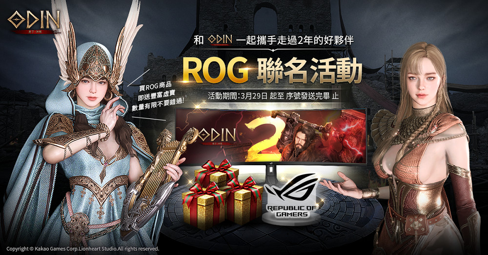 持續歡慶《奧丁:神叛》2週年,官方與長期合作夥伴ROG的異業活動也在如火如荼的進行中。喜愛遊戲與品牌ROG的戰士們,從3月27日起至5月31日,透過ROG的各大線下通路與線上官網購買指定商品,並至ROG活動頁面登錄商品序號,即可免費領取「限量虛寶禮包組」。但請注意,每個遊戲帳號僅限兌換一次,且數量有限,領完為止。