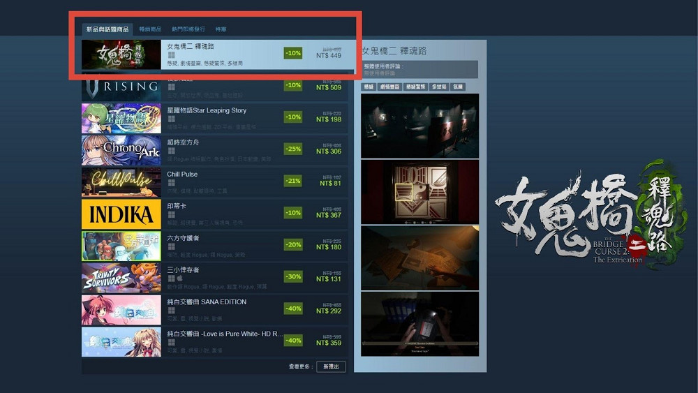 由大宇資訊開發,承襲台灣原創恐怖IP《女鬼橋》的正宗續作《女鬼橋二 釋魂路》,於台灣時間5月9日在Steam平台釋出完整版後,開賣短短不到半天,立即衝上Steam平台「新品排行榜」全球第一,並同步躍上「暢銷商品」排行榜第四,雙雙屢創佳績。