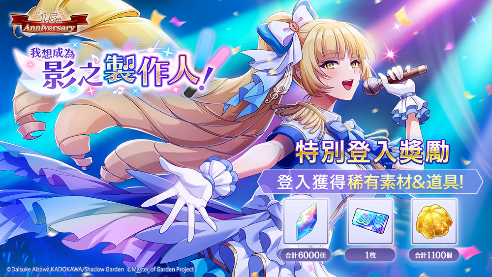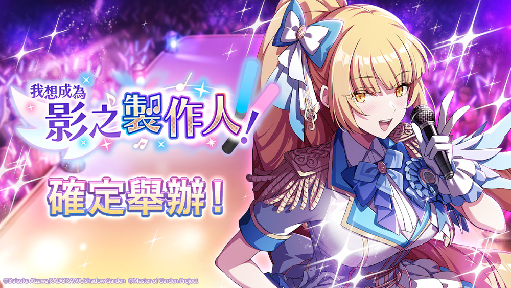 由大宇資訊旗下星宇互娛所代理之《我想成為影之強者!Master of Garden》,同步日版1.5周年舉辦超豐富慶祝活動,限定活動「我想成為影之製作人!」正式開始,人氣角色「亞蕾克西雅·米德加」、「蘿絲·奧里亞納」在米德加學園祭中化身偶像帶來完程度超高的演出,若沒有製作人從後輔助是絕對不可能辦到的,究竟影藏在她們背後的推手是誰?