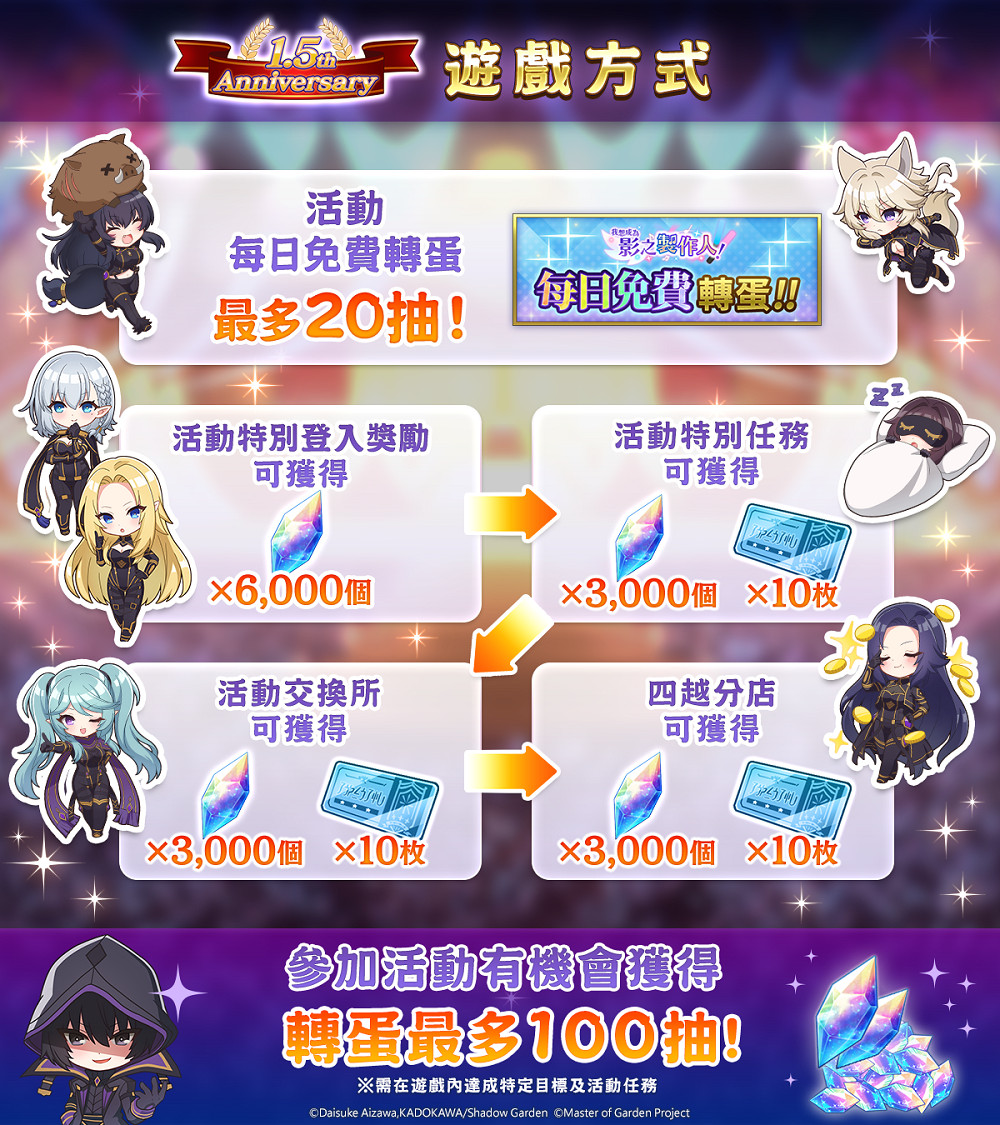為了慶祝「我想成為影之製作人!」的舉辦,遊戲內同步開啟超豪華登入獎勵,從5月16日(四)12:00 ~ 6月6日(四)12:59為止,登入遊戲將可以獲得包含免費幻魔石、確定獲得SS角色轉蛋券、頂級魔汁軟糖等各種道具,務必每日都登入遊戲進行遊玩!