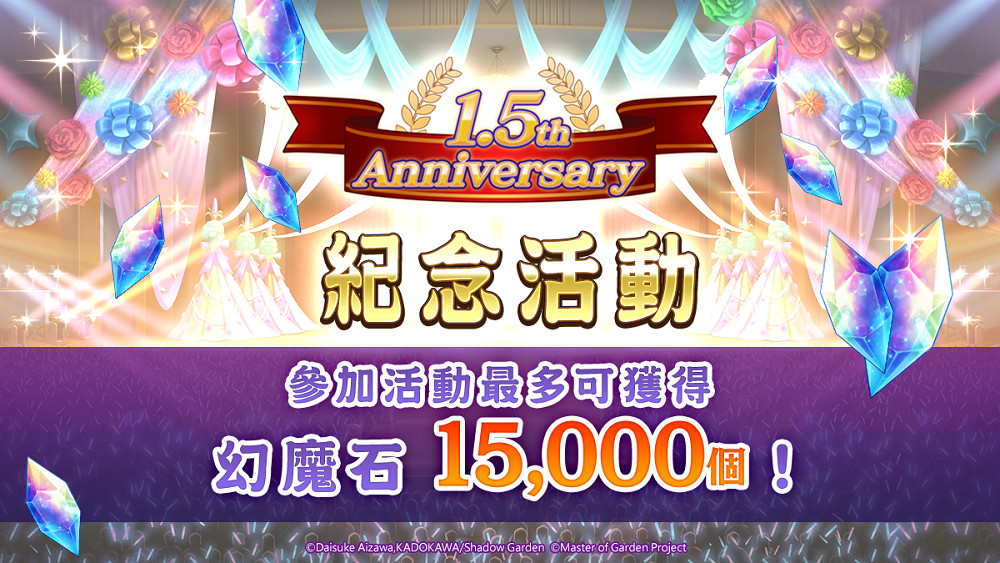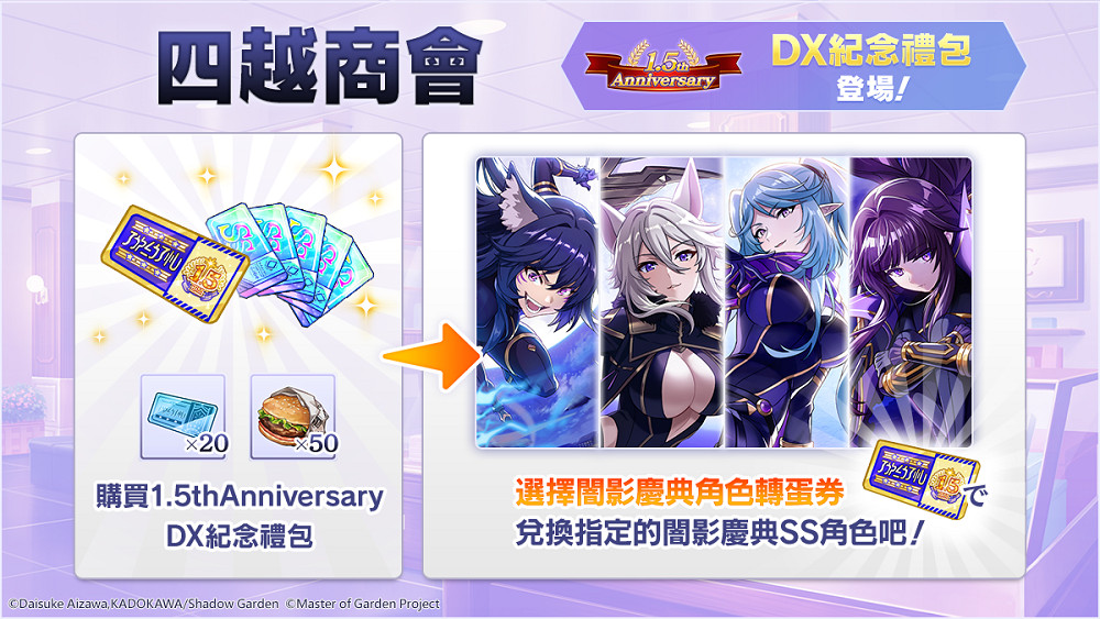 此次紀念活動,官方也特別推出每人限購一次的特殊禮包「【1.5周年】1.5thAnniversaryDX紀念禮包」,只要花費10000付費幻魔石就可以獲得選擇闇影慶典角色轉蛋券1個、保證獲得SS角色轉蛋券5個、一般轉蛋券20個、「鮪當勞」漢堡50個。