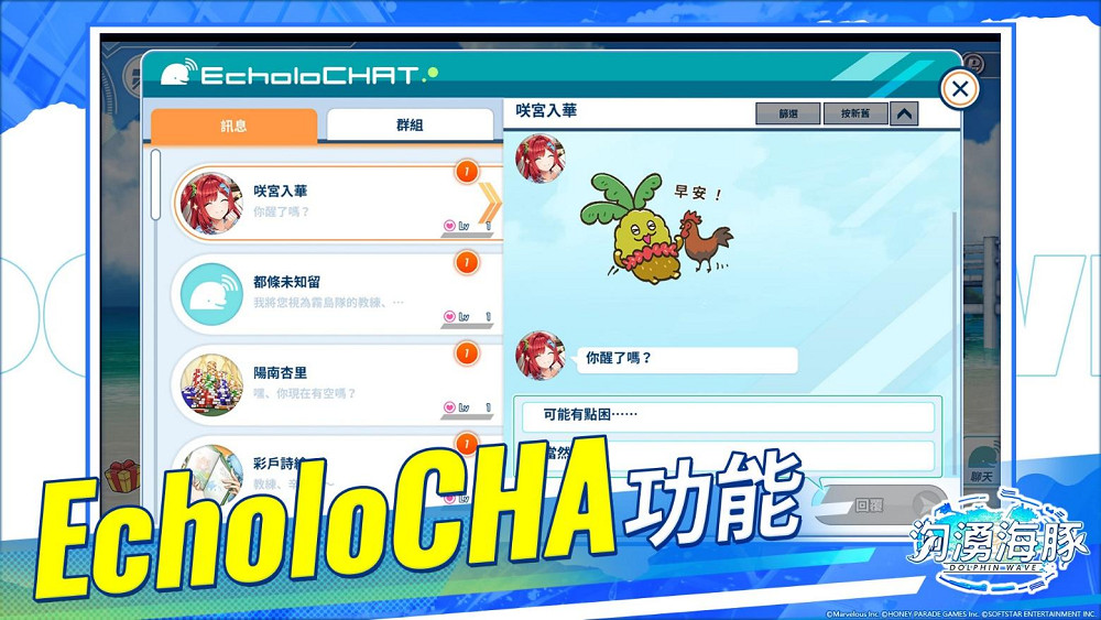 在「EcholoCHAT」中,可以享受和海豚們進行單獨對話或群組聊天的樂趣,隨著互動交流提升你跟海豚的感情,與海豚的親密度等級便會逐漸提升,解鎖各種特典獎勵,同時當親密等級到達一定程度並滿足條件時,將會解鎖對應海豚的個人專屬劇情!