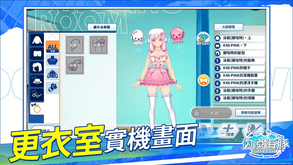 「更衣室」顧名思義,教練可以在這更換每位海豚的服裝,六個不同的部位都可以單獨選擇自己喜歡的配件或髮型,甚至還能夠透過消耗調色點數來更換各部位的顏色,從細節開始打造讓你心動的海豚娘!