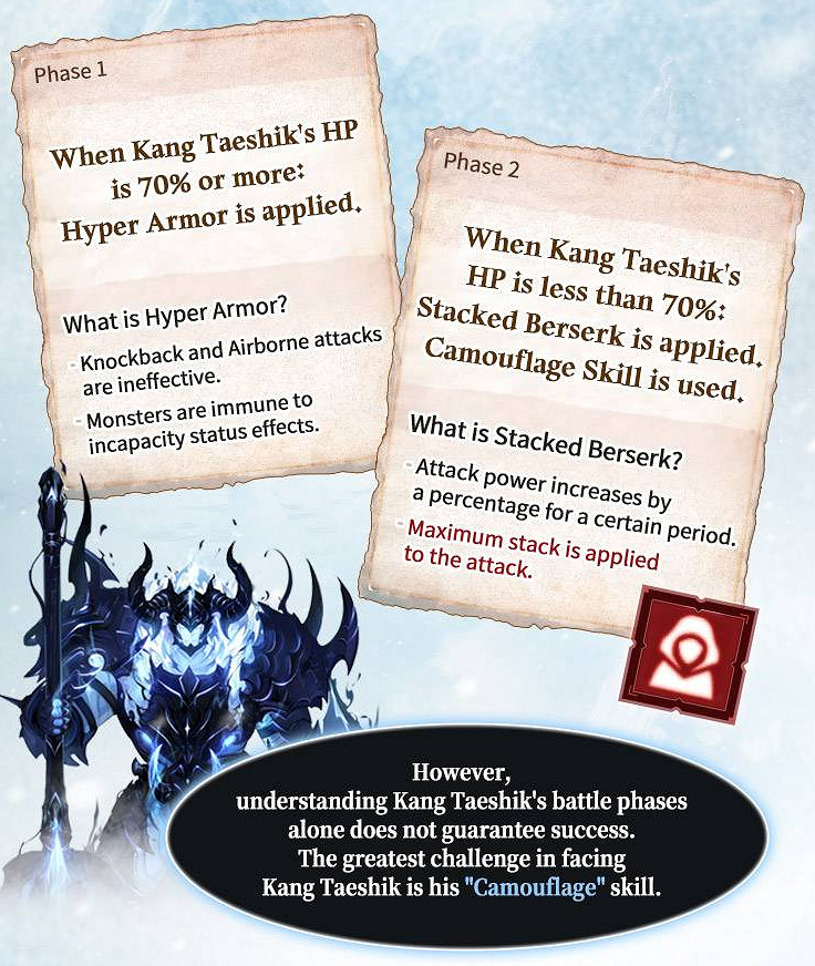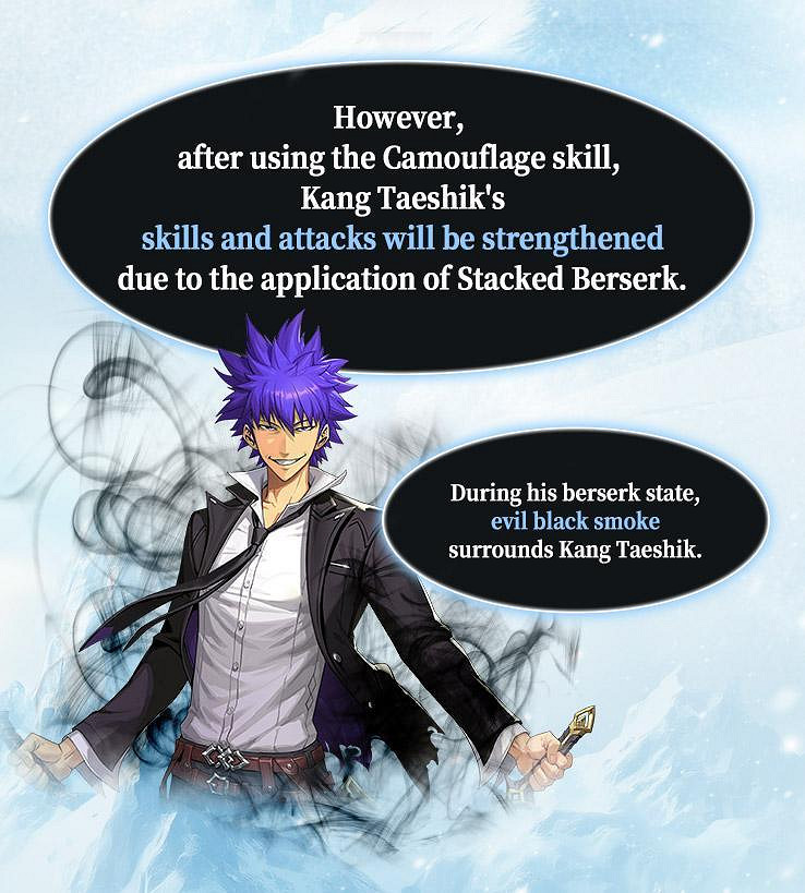 使用「隱身」技能後,姜泰植的技能和攻擊力會受到狂暴化的效果而提升。狂暴化狀態下的姜泰植會被邪惡的黑色煙霧所壟罩。建議玩家善用「衝刺」盡可能地減低來自姜泰植的傷害。