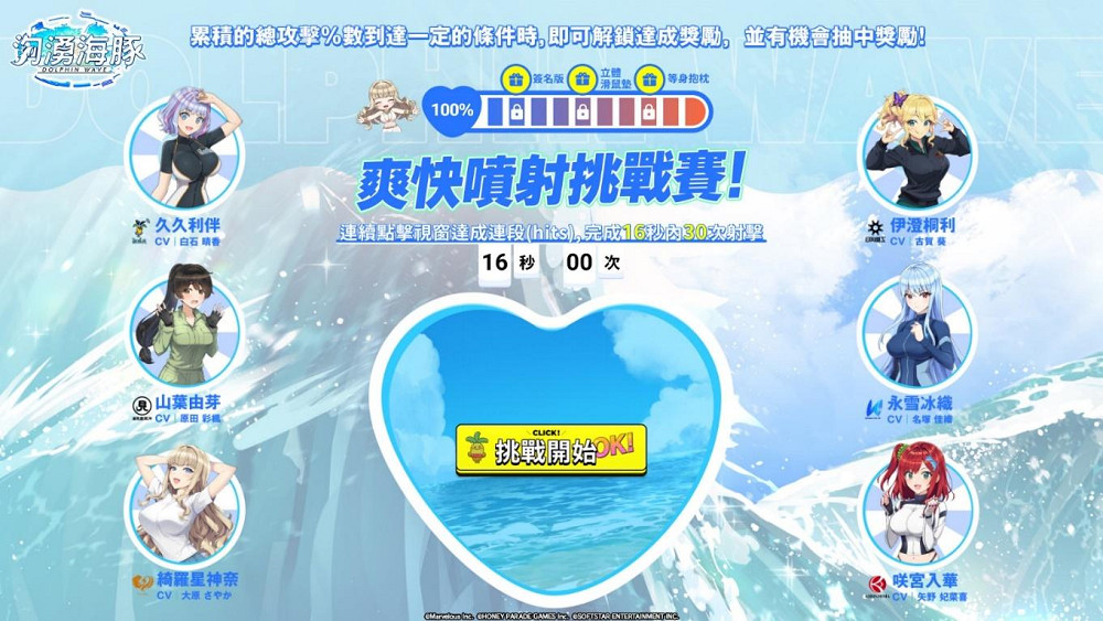 同時事前預約加碼活動【爽快噴射挑戰賽】也於今日開始,選擇教練們喜愛的海豚娘,並且使用水槍連續點擊視窗達成連段,就能夠跟所有教練們一起累積總攻擊加成分數,當加成分數達到一定的條件時將可以解鎖達成獎勵,就有機會抽中限量周邊!並且官方粉絲團也舉辦了抽獎活動,只要貼出你的連段次數,就有機會獲得MyCard點數~